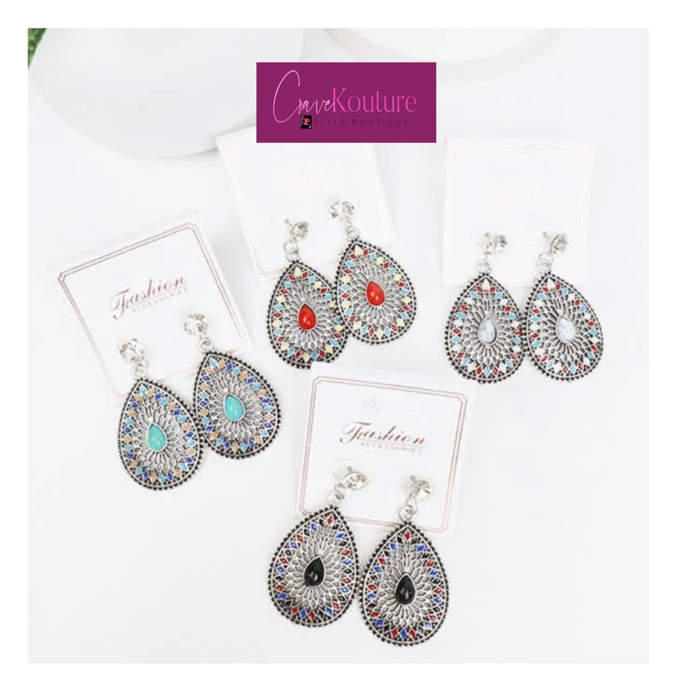 Crave Bohemian Earrings come in 4 different colors. Unique with center stone vibrant colors. Earrings measure approximately 2.5 inches.