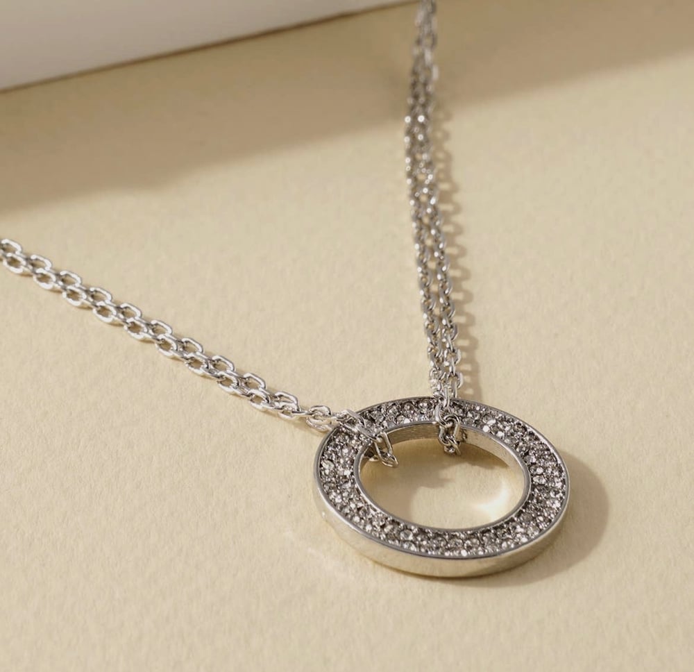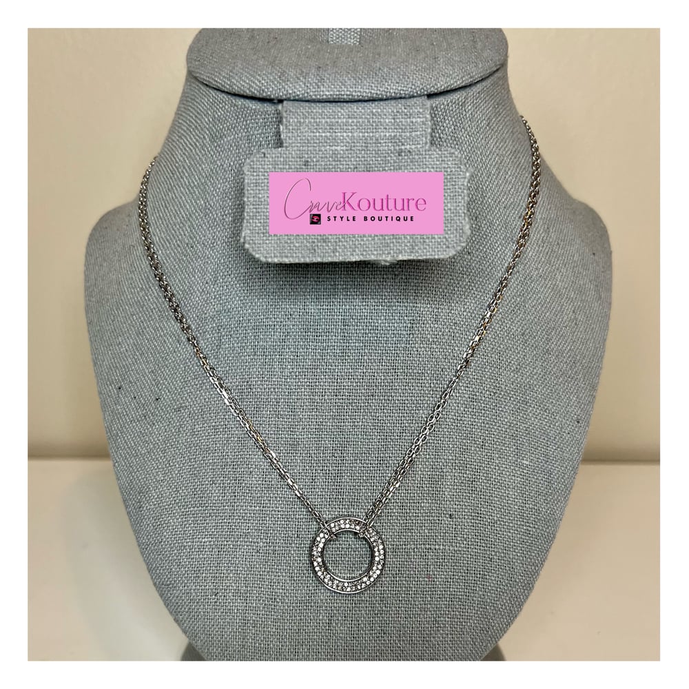 Crave circle pendant necklace comes in silver only. Necklace measures 18 inches with extension for extra length.