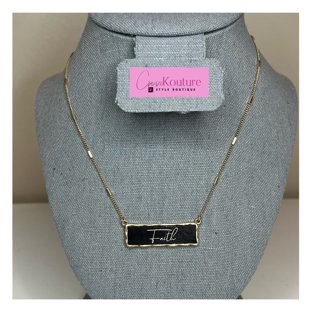 Crave Faith Too Necklace comes gold and black. Necklace measures 28 inches long.