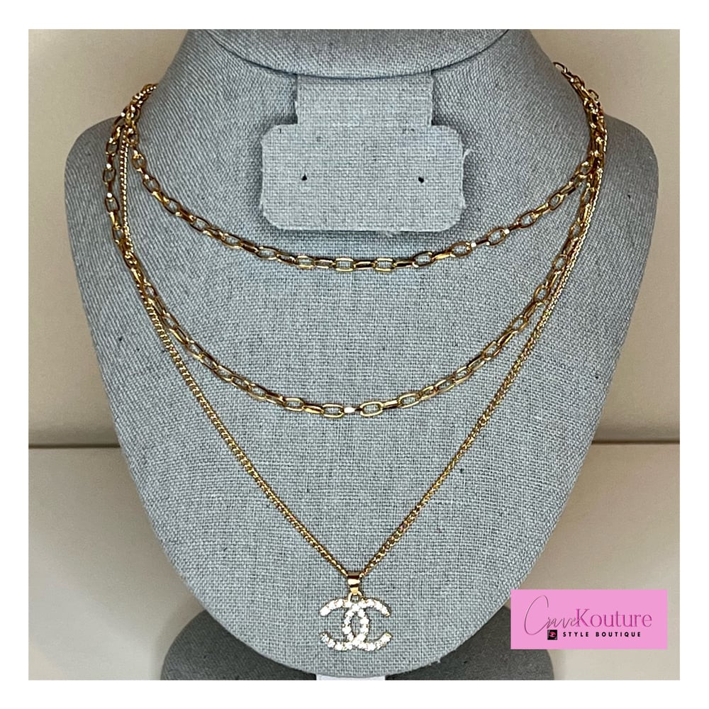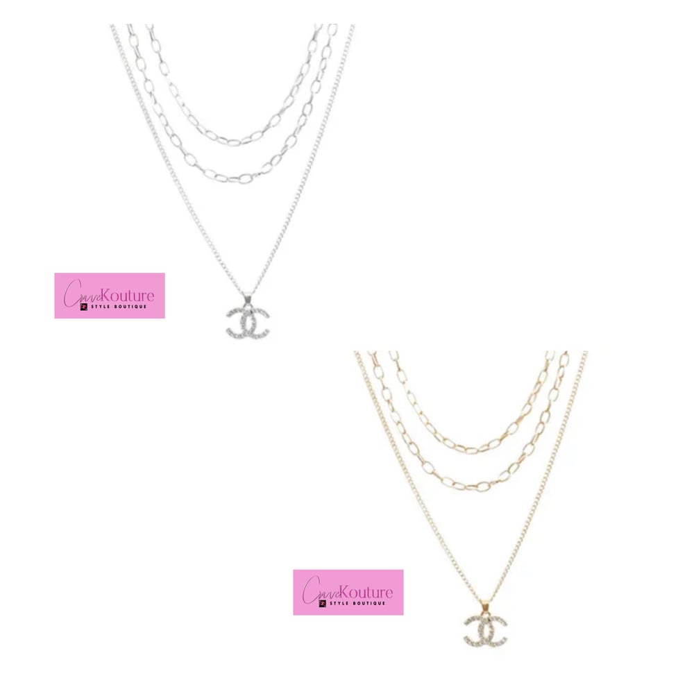 Fashionista ready with this tripled inspired CC necklace. Necklace comes in both silver and gold. Necklace measures approximately 18 inches.